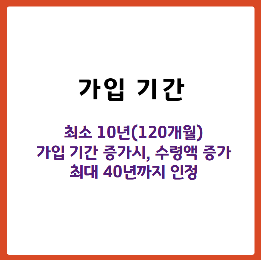 연금을 수령하기 위해서는 최소 10년(120개월) 이상의 가입 기간이 필요합니다. 가입 기간이 길수록 연금 수령액이 증가하며, 최대 40년까지 인정됩니다.