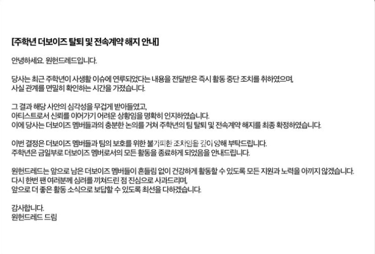 더보이즈 소속사 원헌드레드는 팬카페를 통해