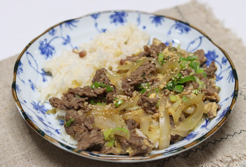 - 팬에 불고기를 볶아주고 밥을 올려주세요.