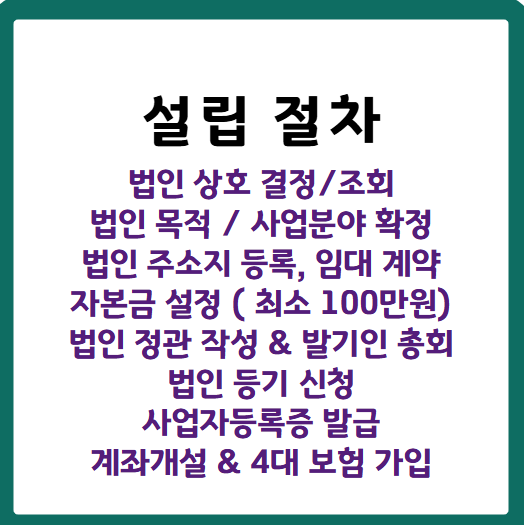 ✅ 설립 절차 – 법인 상호 결정 → 정관 작성 → 등기 신청 → 사업자등록