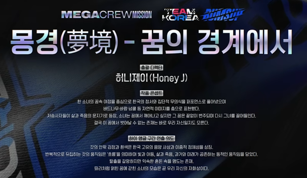 - 특이점: 한국 전통 요소 기반 (탈춤, 상모, 부채춤 등)