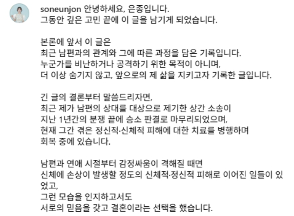 은종은 “누군가를 공격하기 위한 글이 아니다. 자신과 가까운 이들을 지키기 위한 기록일 뿐”이라고 밝혔는데요.