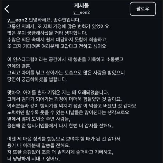 송수연 본인 인스타를 통해 협의 이혼 사실을 고백하며 모든 궁금증에 답했습니다.