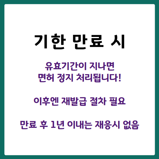 - 만료 전까지 갱신 못 하면 면허 정지 → 이후엔 재발급 절차 필요