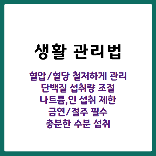 | 식단 | 단백질·염분·인 조절, 항산화 식품 섭취 |