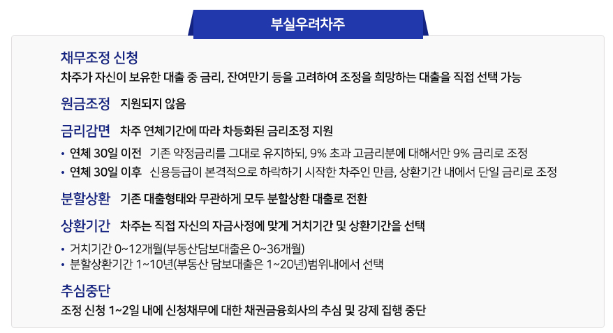 ✅ 부실 & 부실 우려 차주 대상 대출 조정 및 감면 지원