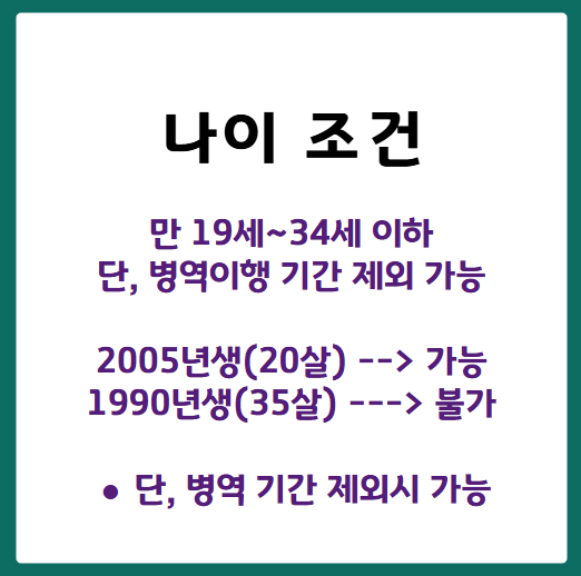 | 나이 | 만 19~34세 (병역 복무기간 제외 인정 가능) |