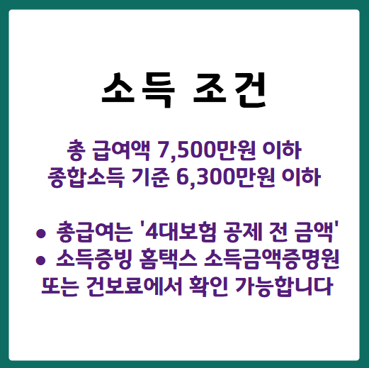 | 소득 | 직장인 연 7,500만원 이하 / 프리랜서·자영업자 연 6,300만원 이하 |
